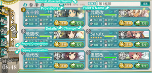 Composition (編成) is a main menu function that appears in the main home screen. This menu is meant to organize the fleets, "heart lock" girls, view girls Stats, or record and deploy preset fleets.