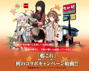 On September 28th, 2016, there will be a collaboration with the Nakau Fast Food Restaurant chain in Japan. Currently, it's known that Akagi, Kongou, Mizuho, Akitsushima, Akebono, Roma, Yuudachi, Amagi, Yamashiro, and Heavy Cruiser Princess will be featured in the collaboration. In addition, based on the information on the site, the campaign will feature 3D cards which will be sold and a contest which will give out Udon Bowls, Posters, and metal cards sets similar to Sukiya Collaboration. As with previous collaborations, special fast food themed CGs will be placed into the Kancolle browser game.