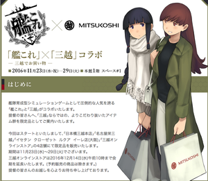 Starting on Feburary 22nd, 2019 KanColle partook in a collaboration with Mitsukoshi along with Isetan (a clothing store company) in which they performed a full scale collaboration which was one of the largest collaborations as of yet.