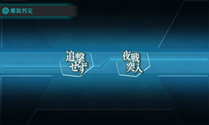 If you do not wipe out the enemy fleet during the day, after the first stage of the battle you will have the option to make a night attack (夜戦突入) . The damage of both your own ships and those of the enemy is greatly increased during a night attack, especially for ships that utilize torpedoes. Select stop pursuit (追撃せず) if you wish to end the battle.