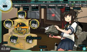 This screen is where you'll be spending most of your time in Kantai Collection. The ship girl on the right is the flagship of your first fleet and will speak if you click on her, also referred as your secretary.