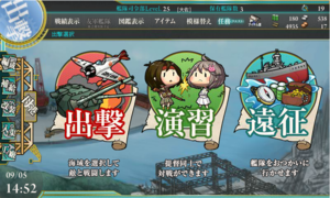 - Sortie (出撃) - Send your fleet on a mission to fight enemies and find new ship girls. The main game mode.